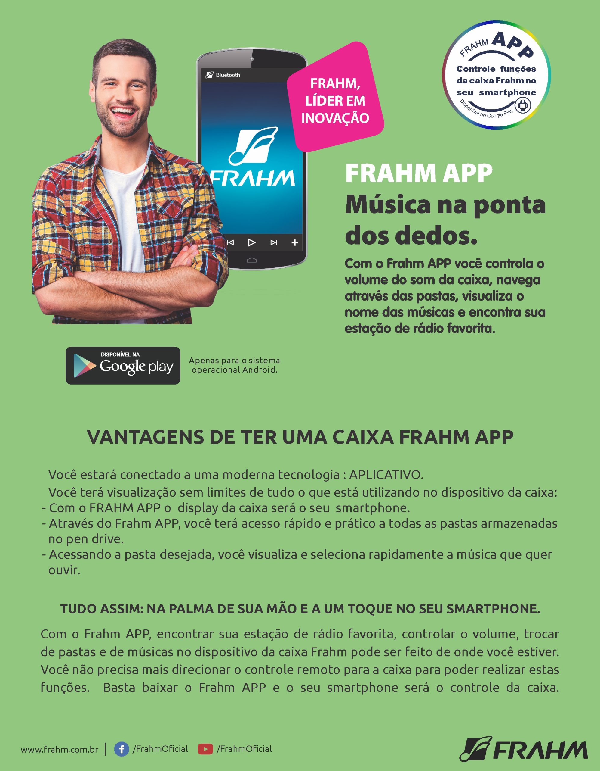 A caixa amplificada MP2000 APP da Frahm possui 200 W RMS, é muito potente e eficiente. O aplicativo para android permite controlar as funções da caixa na palma das suas mãos. Completa, ela possuí entrada USB, SD card, rádio FM, Bluetooth, entrada auxiliar, para violão, guitarra, contrabaixo, teclado, 2entradas para microfone, tudo isso com ajuste individual de volume. Além disso, é possível conectar outra caixa amplificada através de sua saída line out e fazer equalização de graves, médio graves, médio agudos e agudos.